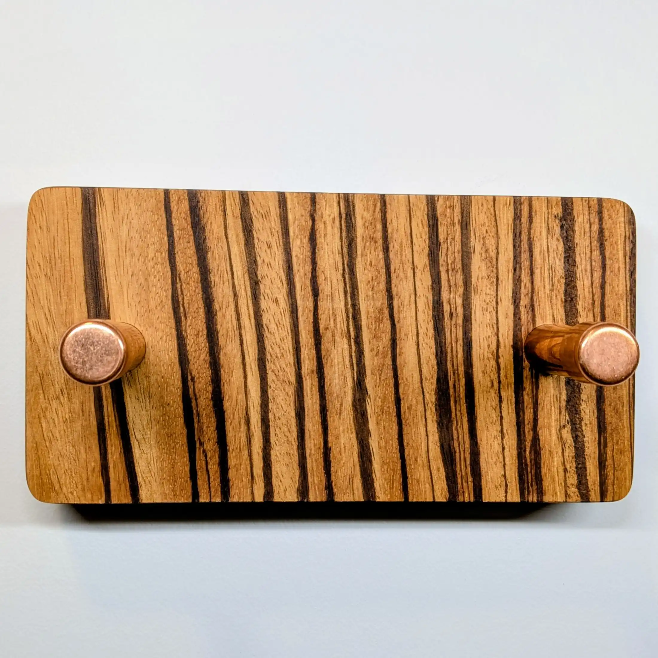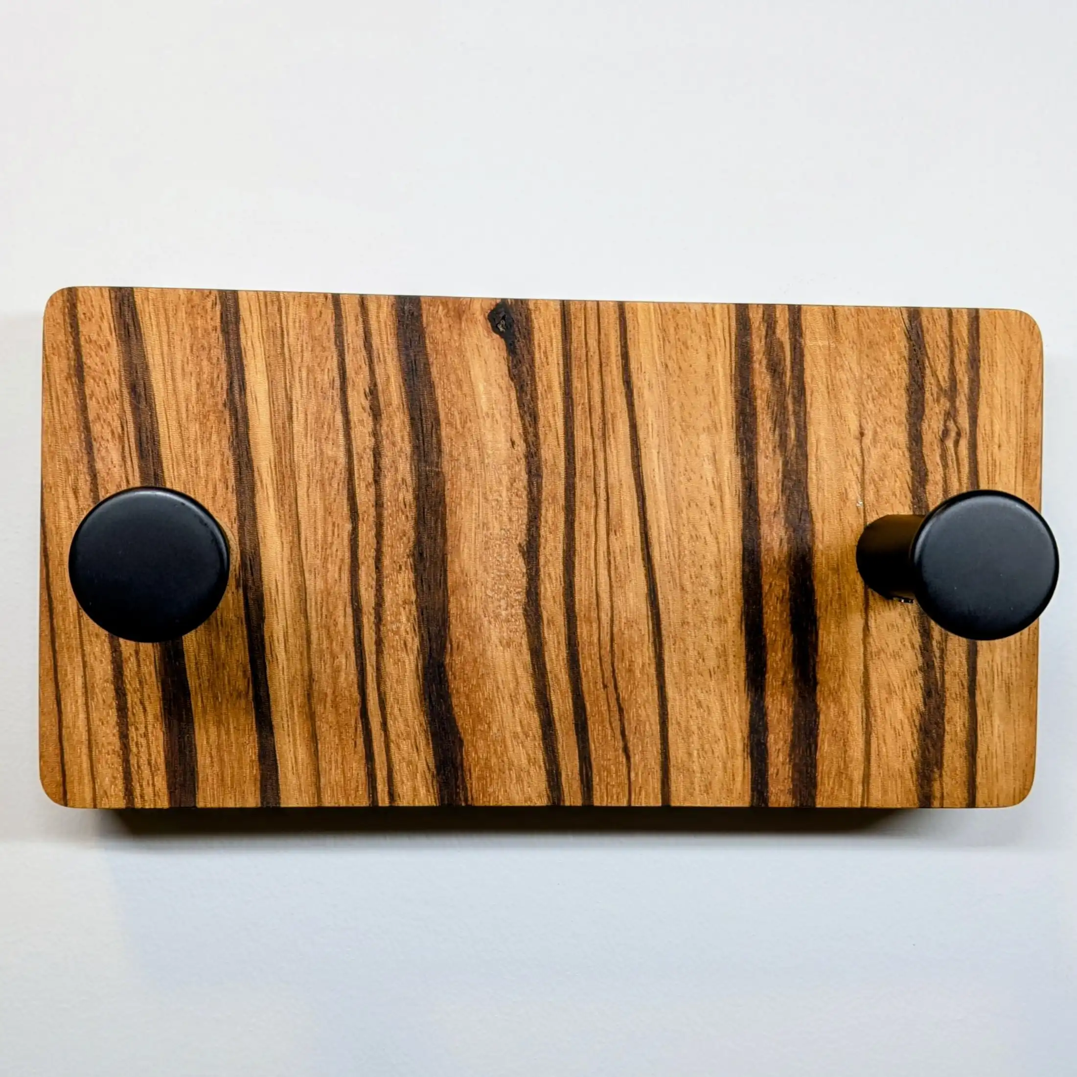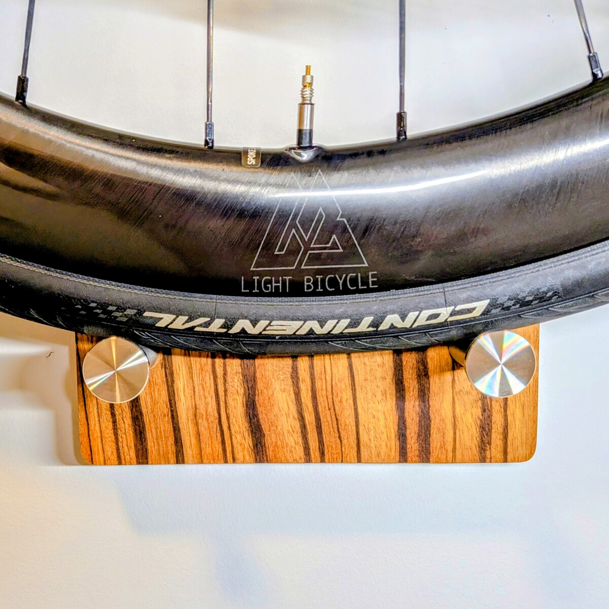 Handmade wooden bike wall mount with exotic wood options and customizable metal pegs. Modern, minimalist design for secure, space-saving indoor storage.