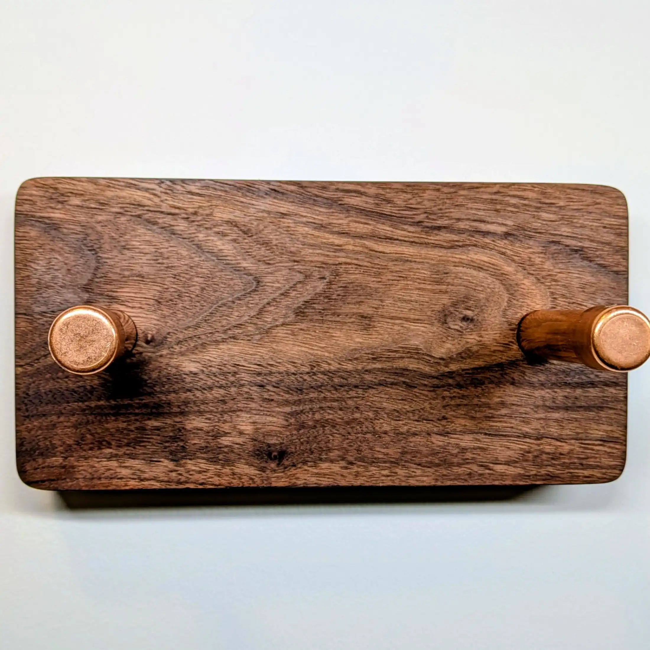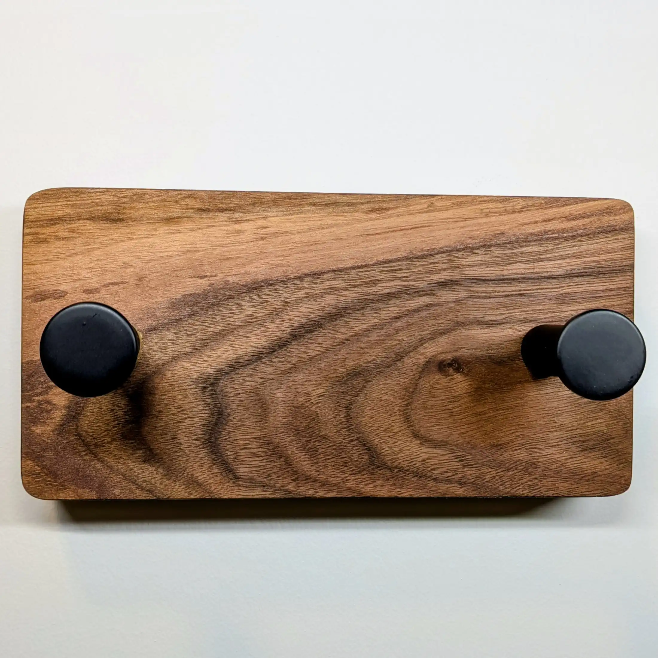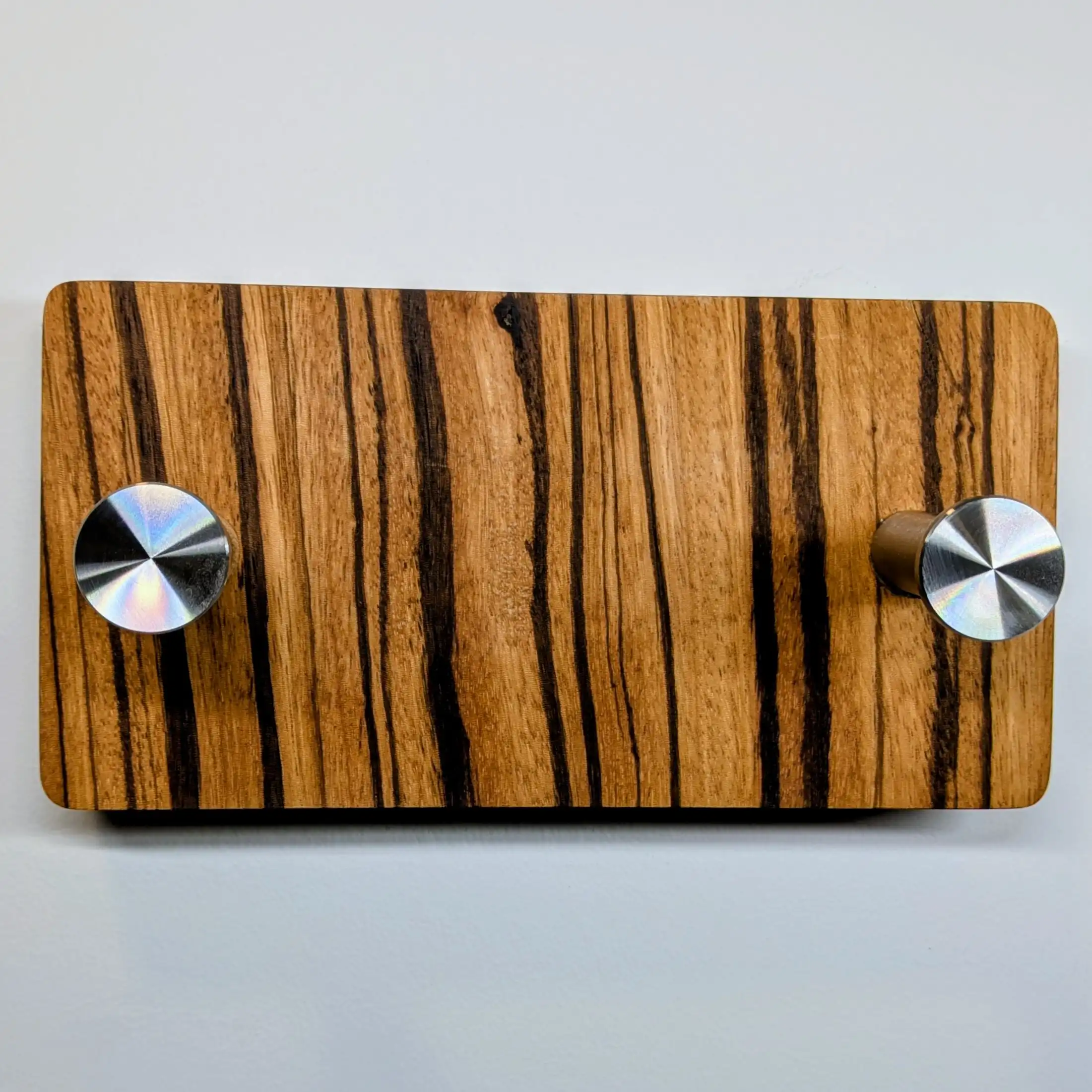 Handmade wooden bike wall mount with exotic wood options and customizable metal pegs. Modern, minimalist design for secure, space-saving indoor storage.